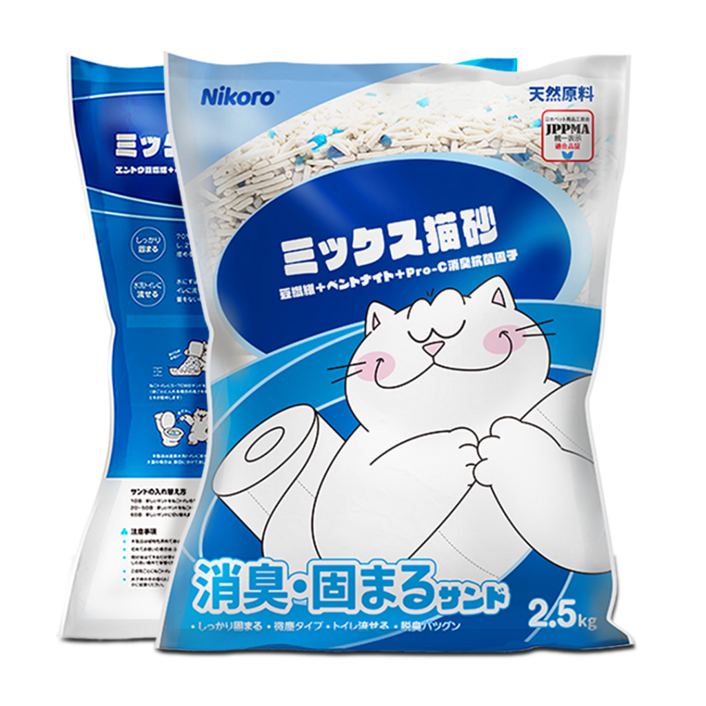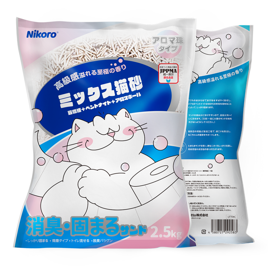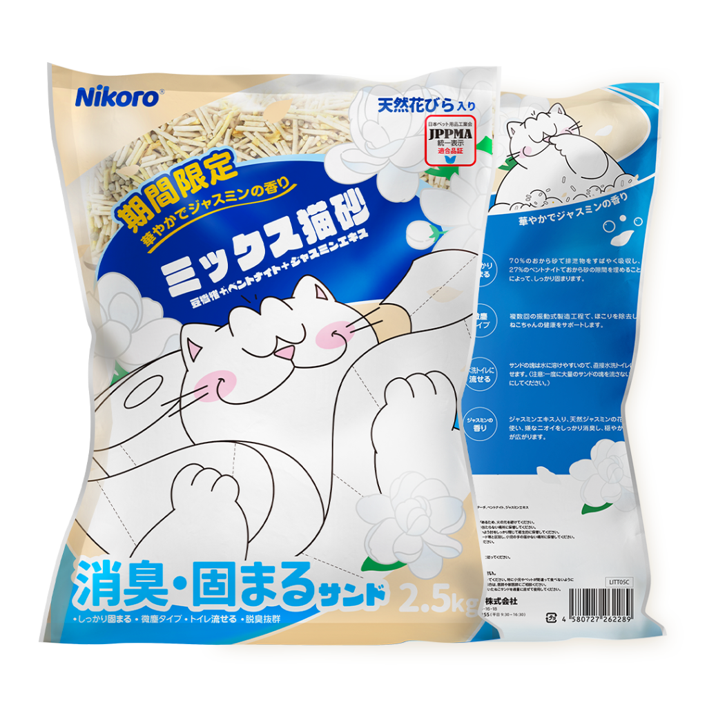 Nikoro Jasmine adalah pasir kucing campuran tofu dan bentonite yang diperkaya dengan kelopak bunga melati alami.
